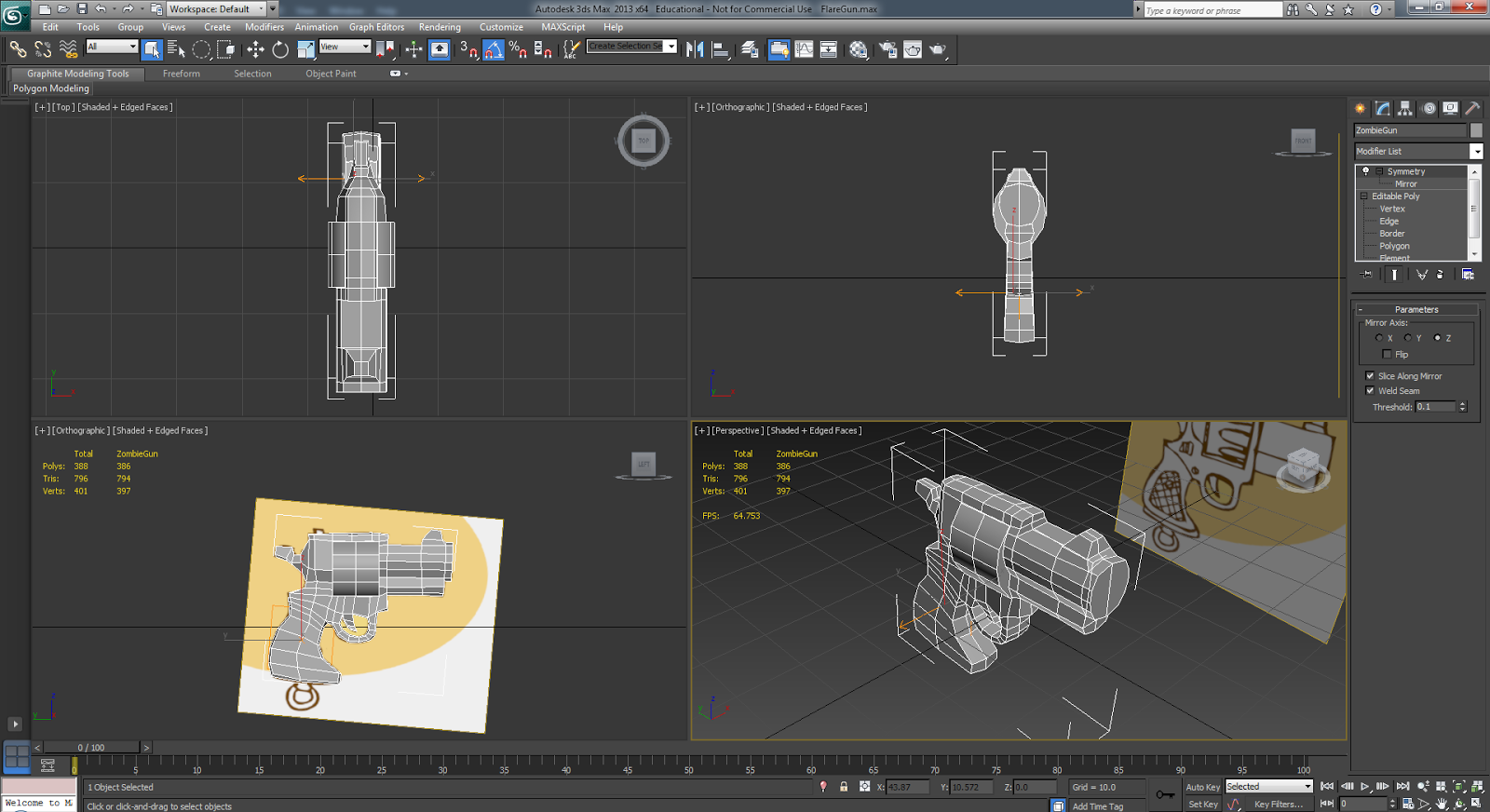 To begin with I started off by simply modelling the gun over the concept art, trying to keep the shape and cartoony nature of the pistol. I found the most challenging part to be in keeping the shape of the barrel and chamber, as in order to keep their roundness they made use of a lot of triangles.